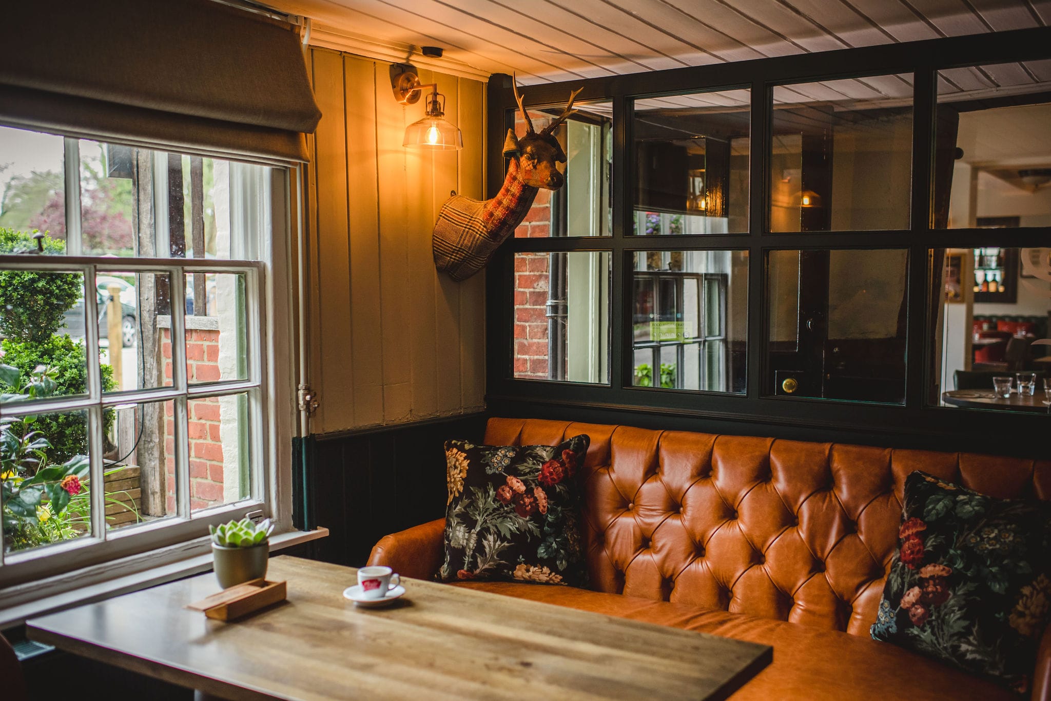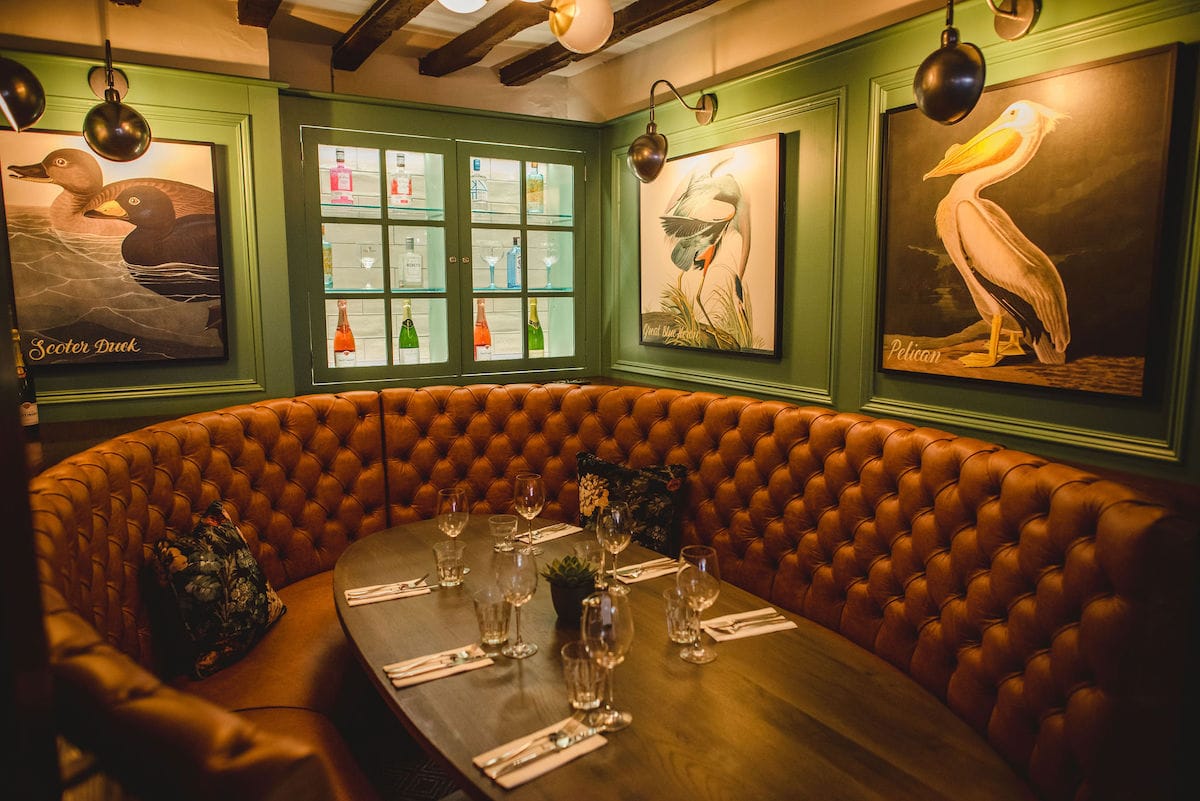 Already proving popular with guests, we designed a large, buttoned-back oval booth, upholstered in a rich tan leather. Wall panelling was installed and painted in a matt olive green, providing a great backdrop to display vintage prints of river birds. An original beamed ceiling and new illuminated wine store create atmosphere and intimacy.
