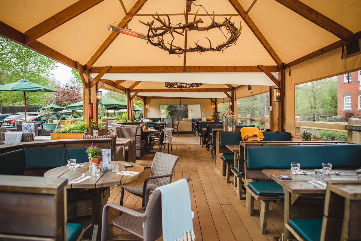 Improved and greatly expanded outside seating makes the most of The Stag’s incredible riverside setting, and allows RML to maximise usable outside space to serve more guests safely. The focus on comfort and design details continued here, with new timber-framed spaces allowing customers to enjoy the views and sounds of the river while remaining warm and dry under canvas canopies.